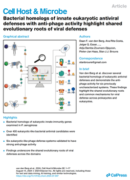 108. Van den Berg DF, Costa AR, Esser JQ, Stanciu I, Geissler JQ, Zoumaro-Djayoon AD, Haas PJ, Brouns SJJ. Bacterial homologs of innate eukaryotic antiviral defenses with anti-phage activity highlight shared evolutionary roots of viral defenses. Cell Host Microbe. 2024 Jul 24:S1931-3128(24)00266-X.